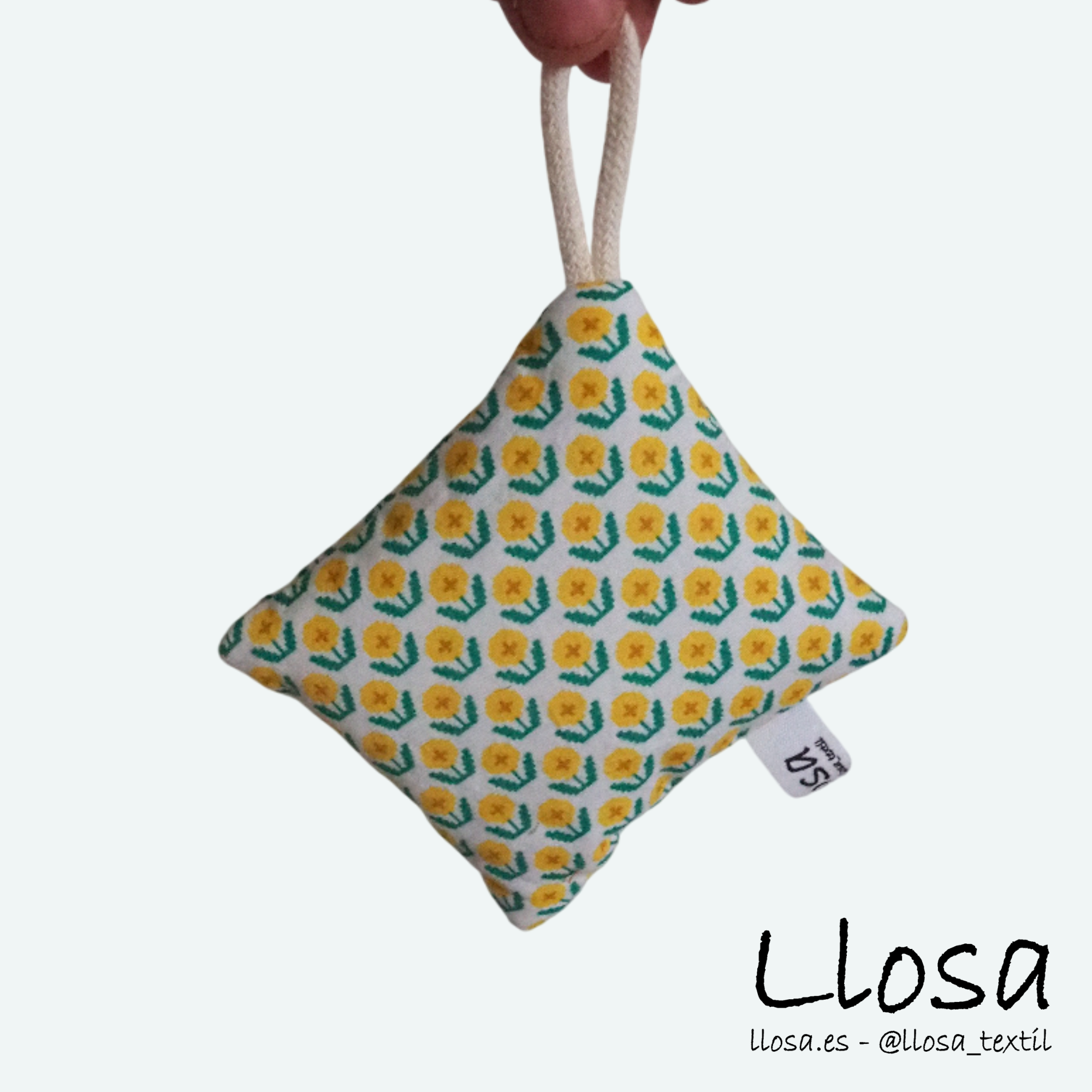 Saquito aromático artesanal con estampado de flores. Relleno de lavanda natural 100%. Aroma suave y relajante, ideal para colgar en armarios, cajones o mesillas.